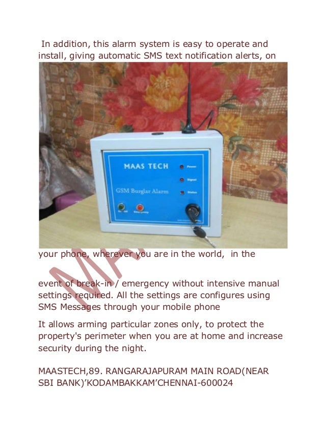 Chennai-600 002. Call: 9380952616, 9952078807, 9150273567, 4311 4999, Burglar Alarm (Theft Alarm | Shadow Alarm | Ghost Alarm) 2. PIR Security Alarm 3. Gas-Leak Safety Alarm 4. Fire Alarm 5. Earth Quake Safety Alarm 6. ... Retrieve Doc